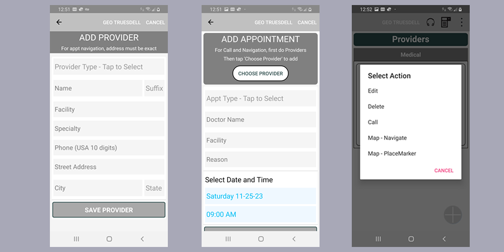 If you wish to use the Maps Navigation feature when you tap on an appointment in the APPOINTMENTS screen, then you must enter your PROVIDER information FIRST (including full address and 10 digit phone number). Then, when you click on your APPOINTMENT you will then see these options and more: